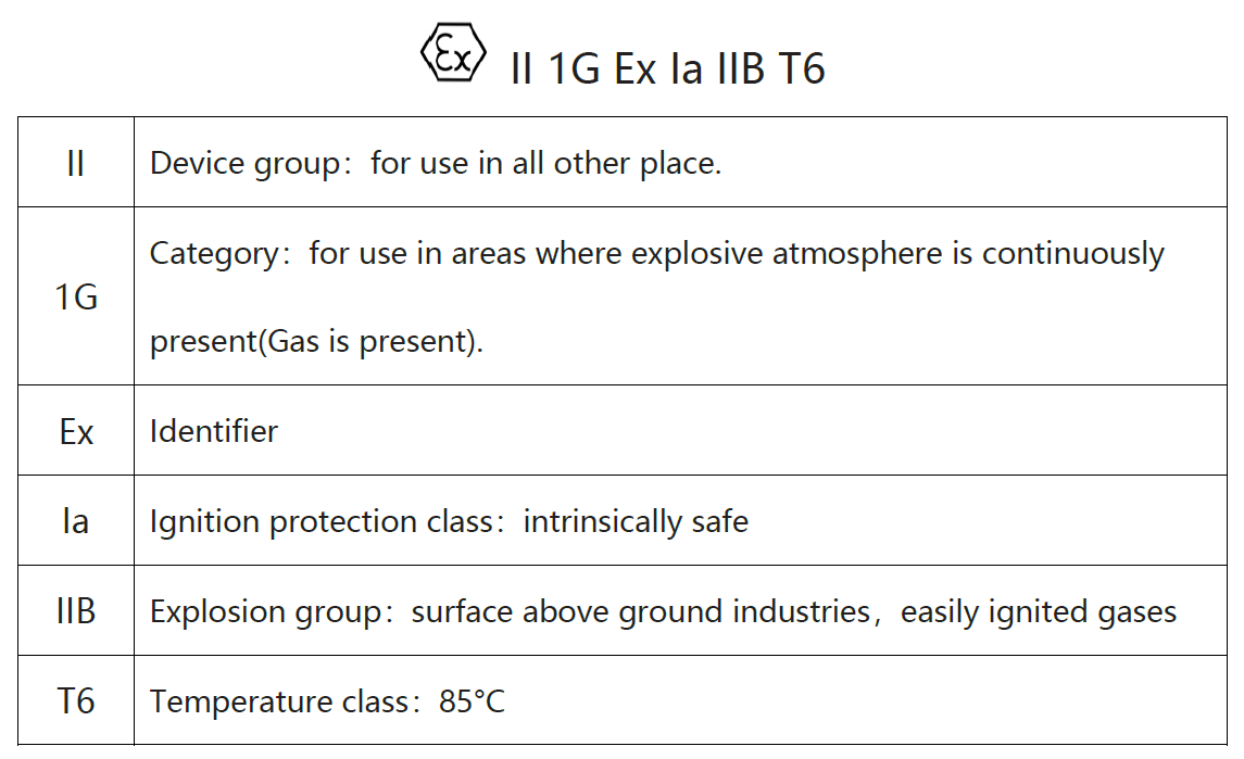 The hazard level of materials increases from Explosion Group IIA to IIC. The requirements for the devices increase accordingly. If a device is approved for IIC, it can be used for all other explosion groups. Alternatively, the chemical formula or the name of the material can be stated here.