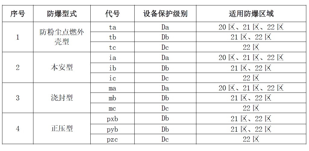2、 Explosion proof protection type,The explosion-proof protection measures, explosion-proof protection types, and corresponding code relationships adopted by the equipment are shown in the table below.