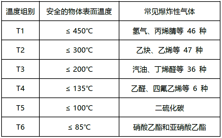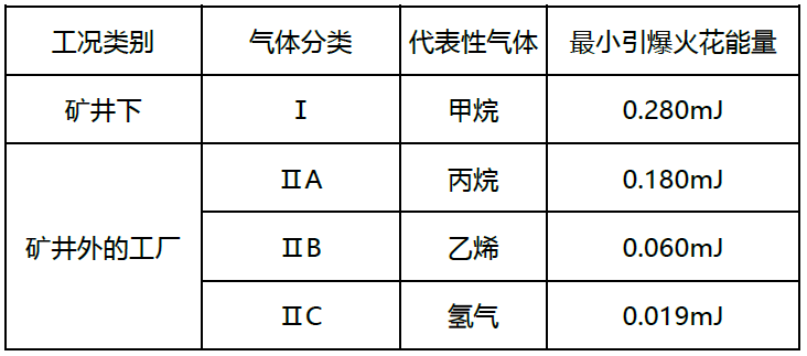 根據(jù)可能引爆的zui小火花能量,我國和歐洲及世界上大部分國家和地區(qū)將爆 炸性氣體分為四個危險等級 , 如下表 :