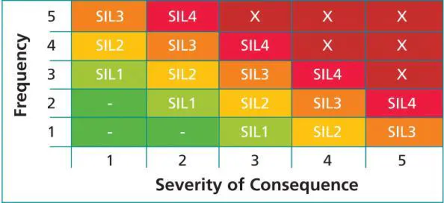 根據IEC標準的定義,有四個SIL級別(1-4)。 較高的SIL水平意味著更大的過程危害和SIS所需的更高級別的保護。 概括如何確定SIL水平,參見圖1。SIL水平是危險頻率和危害嚴重程度的函數。 可能更頻繁發(fā)生或具有更嚴重后果的危險將具有更高的SIL水平。